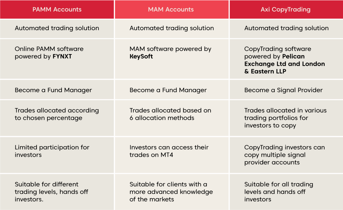 Enjoy mutually beneficial terms and fair rewards. Axi’s PAMM service is carefully designed to be profitable for everyone involved. This includes PAMM Managers, Investors, as well as Partners in the PAMM Introducer Program.