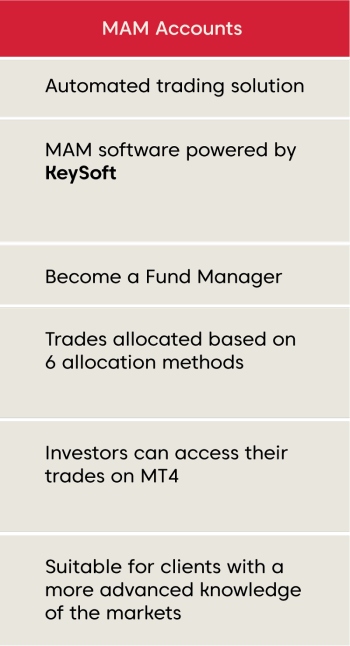 Use your own Master Account to manage an unlimited number of accounts. Set the performance and management fee that works for you. No need to create an investment fund.