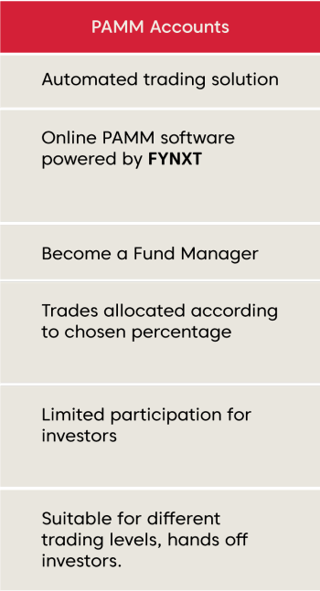 PAMM leverage their skills and earn extra income. If you are confident about your trading strategy, you can set up your own PAMM fund strategy. This way, you monetise your trading skills, while doing something you love.